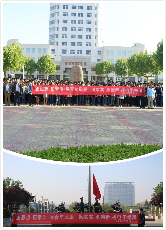 5月17日早上,电子工程学院“正思想,拓素质,展青年风采;倡求实,勇创新,扬电子学风”主题升旗活动在教学主楼前举行。电子工程学院党政领导、辅导员、班主任及非毕业班全体同学参加了活动,学院党委书记陶建兴主持。