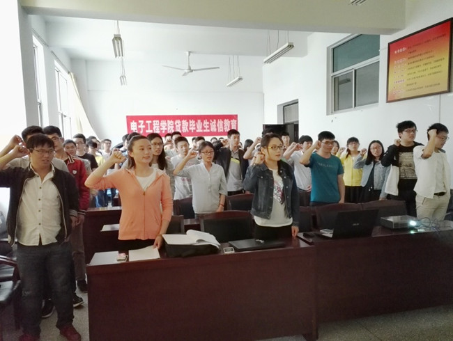为帮助贷款毕业生了解国家助学贷款还款细则,强化资助工作的育人效果,增强学生感恩意识和诚信还款意识,推动国家助学贷款工作的良性发展,5月24日上午,电子工程学院2016届贷款毕业生诚信教育大会暨宣誓仪式在电子楼212会议室举行。学院党委副书记钱汉珍、辅导员丁小青老师和我院75名2016届贷款毕业生参加了活动。