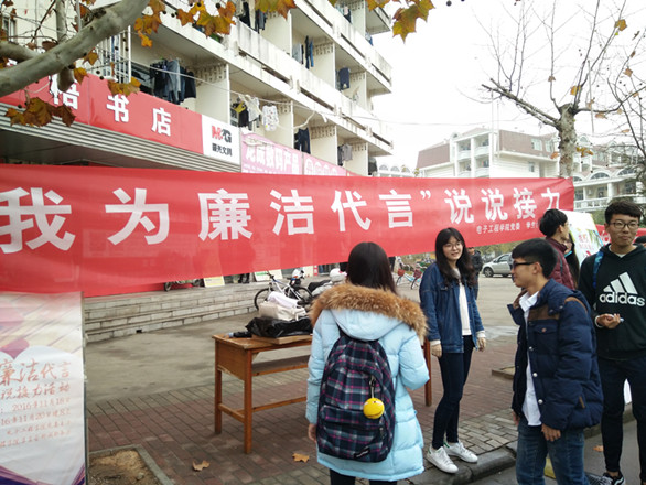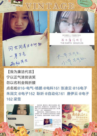 “我为廉洁代言”采用了说说接力的独特形式,2016年11月15日至22日,在一食堂门前和微信、官Q等自媒体上同时进行,通过标明“我为廉洁代言”参与活动,摘选廉洁文化有关诗词、好词好句、创意词句等内容,并写在纸板上拍照,点名@好友至少一人接力发说说或朋友圈,并附上点名者的说说截图和自己的接力照片,依次传递下去。清正在德,廉洁在志,全校师生积极参与本次活动,将自己对廉洁的看法和思考写下并拍照,随后纷纷点名@自己的好友接力,为廉洁代言,将廉洁传递。本次活动借助网络的“东风”扩展开来,至22日晚8点活动截止,参与者纷纷发来了自己的接力截图,大部分点赞数破百,并仍在不断增加。