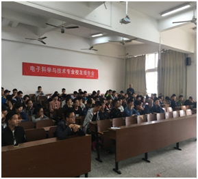 为进一步提高学生的专业认知,增强学习兴趣,提升学习内驱力,电子工程学院分专业开展校友报告交流会。4月21日,电子科学与技术专业校友报告会在A楼205教室举行。本场报告会邀请了该专业两名2010届毕业生张敬波和郭鹏飞到场。电子工程学院党委副书记兼电子科学与技术专业辅导员钱汉珍、电子科学与技术专业负责人程加力,专业教师胡全斌等老师以及本专业三个年级学生参加了报告会。