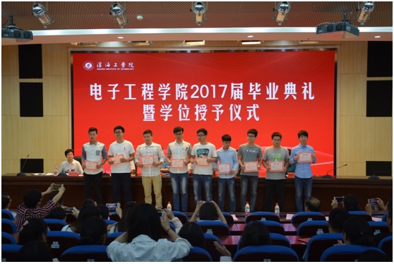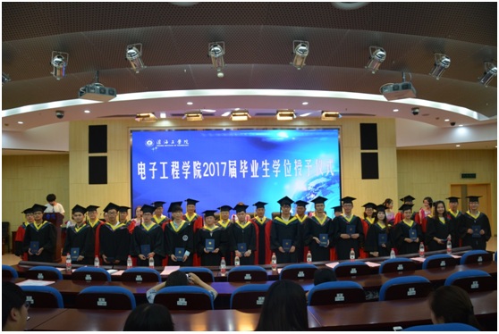 6月21日上午,电子工程学院2017届毕业典礼暨学位授予仪式在会议中心黄海厅隆重举行。副校长刘永强、电子工程学院党政班子成员、全体教授、系主任、专业负责人、实验中心正副主任、党政办、教学办、学工办所有老师、毕业班班主任、辅导员及全体2017届毕业生参加了毕业典礼。毕业典礼由党委副书记钱汉珍主持。