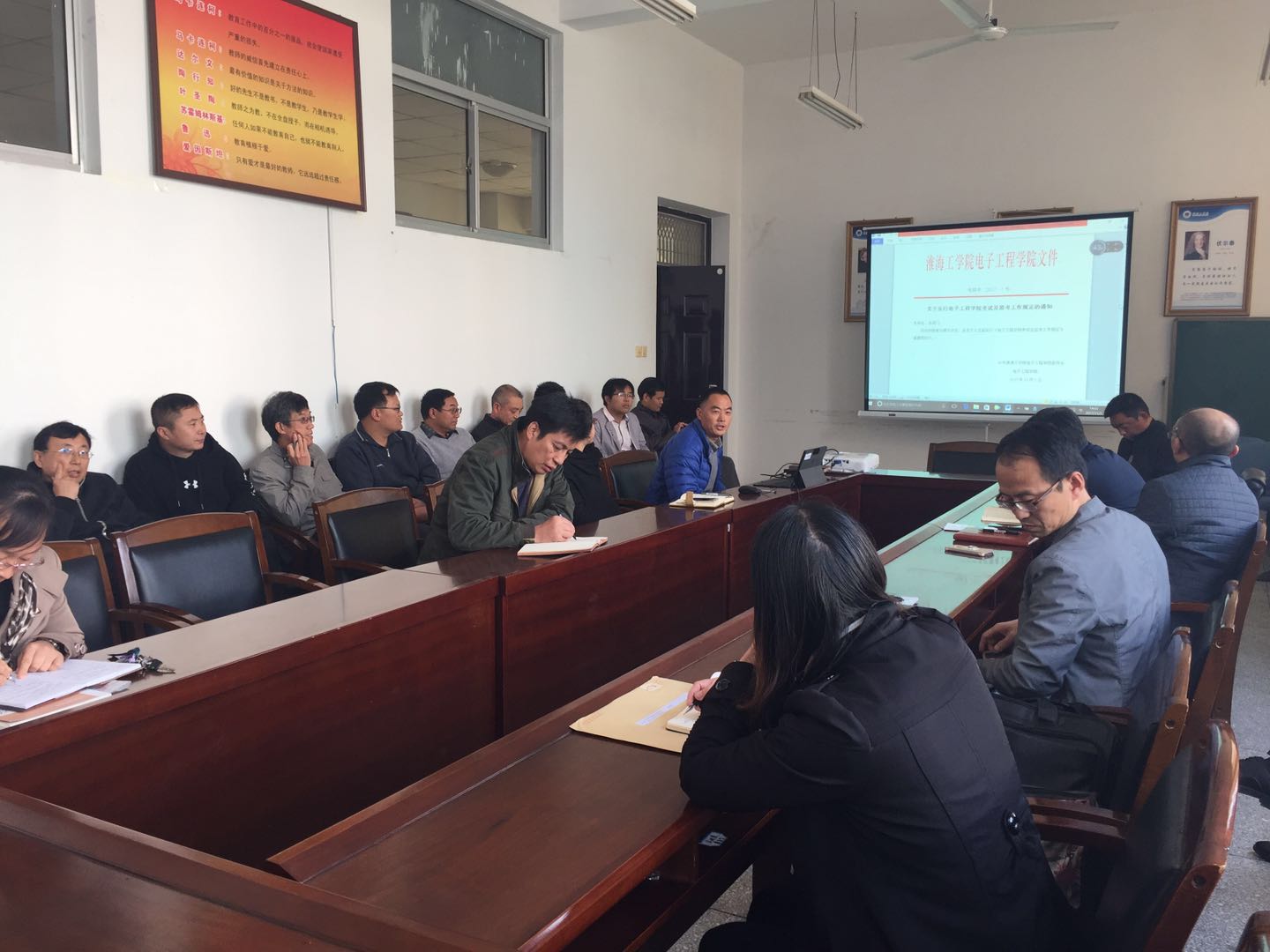 2017年11月1日下午,在电子楼210会议室召开全体教职工会议,会议以师德师风建设,宣传考风考纪为主题,旨在在教师、学生中形成共识,帮助一些对考试认识不准确的同学,将考试违纪、作弊扼杀在考试之前,维护考试的公正公平。
