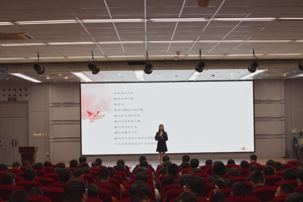 首先上台的是通嵌171的高岩岩,她为大家带来《廉洁之歌》,“采来泰山之禾,掬来东海之波,我要为廉洁引吭高歌。”她目视观众,挽开手臂,为她的朗诵开了头。随着音乐的律动,她的语速也愈来愈快,“廉生明,公生威,廉则吏不敢慢,公则民不敢欺”,并用一个排比结束了她的朗诵。“淡泊明志,清亮如水”,二号选手桑熔带来的朗诵作品是《清水人生》,他把廉洁比喻成清水,指出廉洁同清水一样无色、无味、具有洁身除垢的作用,“做人要如清水,坚守清水人生,才能活得踏实自在”。何以为歌,清清白白,廉洁为歌,三号选手包陆佳带来作品《为廉洁放歌》,她在朗诵中提到奉献革命的先烈,务实为民的公仆,“廉洁方能聚人,律己方能服人,身正方能带人,无私方能感人”,层层递进,为她的朗诵结了尾。紧接着,四号选手刘叶繁上台,用孔子、方志敏对廉洁的感悟,为她的作品《让廉洁为生命导航》开头,并号召大家做一个求真务实、奋发有为的人。《有廉洁乃大,无私品质高》,五号选手乔天翔以对仗的文字及精美的配图,展现他对廉洁的认识,“中国有梦,廉洁护航”,用雄厚的声音凸显本次朗诵比赛主题。最后上场的是由五位同学组成的团队,带来作品《让廉洁为生命导航》,一名选手负责一段,分工明确,展现个人风采,“前路漫漫,群聚而又孤独,扛好廉洁这面旗帜,守好廉洁这座灯塔”,集体朗诵整齐合一,结束后,台下观众纷纷鼓起掌来。