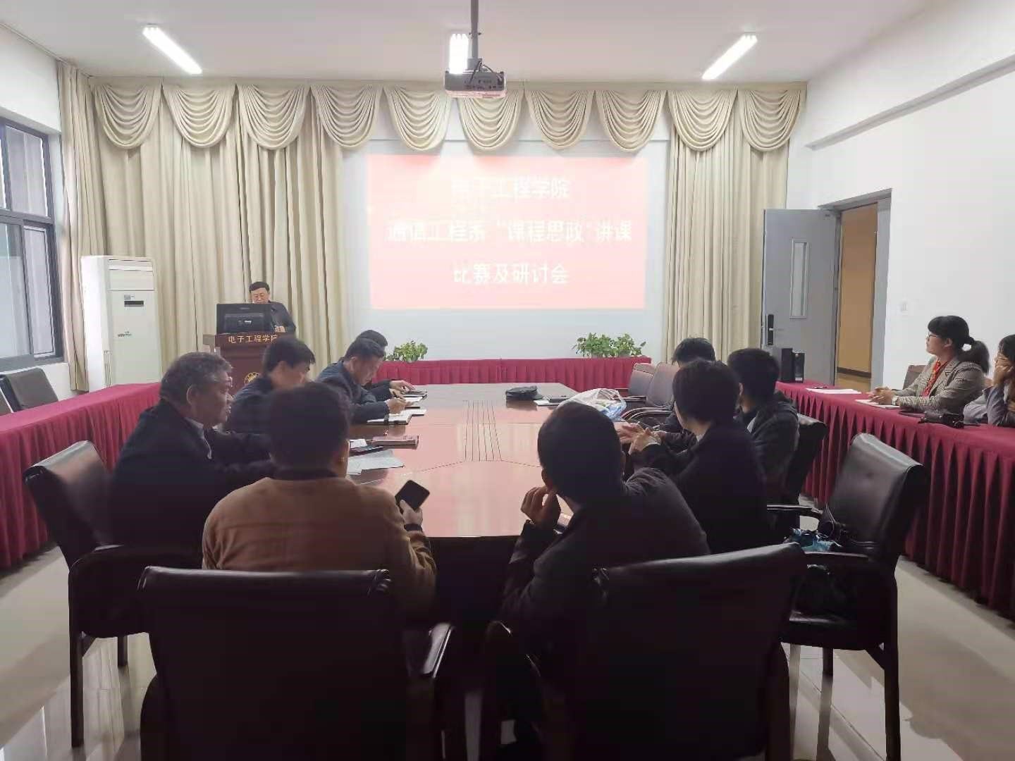 为深入学习贯彻党的十九大和全国高校思想政治工作会议精神,充分发挥专业课程的思想政治教育功能,11月18日,通信工程系在电子楼314会议室举办“课程思政”讲课比赛。讲课比赛由系主任李成主持,学院班子成员、督导组成员担任评委,各系教师到场观摩。