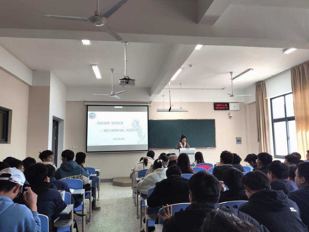 3月22日-3月25日,电子工程学院在2018级开展考研、就业动员宣讲。学院党委副书记张玲做主讲人,全体辅导员、全院9个班级360余人参加会议。