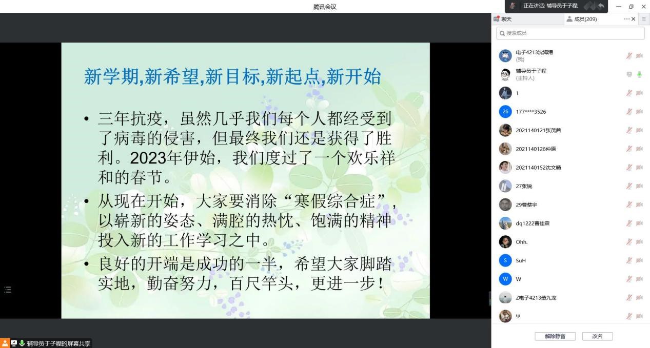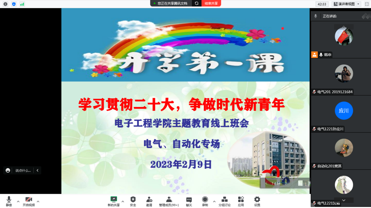 律回春晖渐,万象始更新。开学在即,为使广大学生继续勇敢无畏地迎接新学期,并从思想上和行动上进一步完成由轻松假期到开学考试的转换,2023年开学前一周,电子工程学院全体辅导员按专业召开了春季学期主题为“学习贯彻二十大,争做时代新青年”的“开学第一课”集中教育活动。