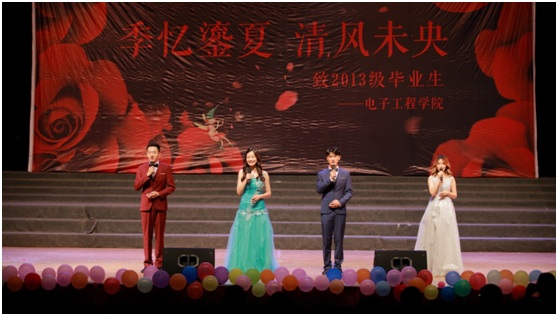 ME街舞社动感炫酷的开场舞拉开了整场晚会的序幕,电子院独具特色的荧光舞表演瞬间点燃全场。高俊逸,李圣文等人带来《独家记忆》、《小幸运》、《成全》、《凉凉》、《茶底世界》歌曲串烧,赢得了在场观众热烈的掌声。台上台下热情高涨,一同高歌,互相为未来打气。青春不散,哪怕时光脚步太匆匆。歌声嘹亮,哪怕泪水盈眶打湿了笑容。电子辩论队为毕业晚会带来了饱含深情的诗朗诵《我们一起走过淮海园》,伴随着轻柔的音乐,让毕业生们回忆起了在淮海园一起走过的美好时光,他们发自内心的情感表达赢得了师生们的连连赞赏,将晚会推向了一个小高潮。阳光手语社的手语表演《化身孤岛的鲸》和着优美的音乐,整齐划一的手语动作引起了全场观众的共鸣。淳乐团带来《红日》加《老男孩》的乐队演奏,他们将这两首歌曲完美的结合,鼓励大家不要放弃自己的青春和梦想,不畏艰难,勇往直前,终会到达胜利的彼岸。电子工程学院郑宏婕老师主唱,商学院张师瑜同学钢琴伴奏给大家带来了一首深情的《乡恋》,引爆了晚会的另一高潮,这种不同于平时教学的互动将成为毕业生们日后最特别的记忆。被誉为“发福利”的互动环节,给观众带来了更多的欢乐。而陈开的吉他弹唱《天空之城》、《斑马斑马》蕴含一丝忧郁的忧伤,所以显得格外动听。电子院学生会文艺部给我们带来了小品《老同学》,台词幽默风趣,全场笑声与掌声不断。女舞《EXERCISE ME》曼妙的舞姿展现了电子女生的魅力,给我们带来了一场精彩的视觉盛宴。毕业学长王启航和郭子阳的男生合唱《黑暗骑士》唱响了对大学四年的追忆和对未来的希冀。最后晚会以毕业代表讲话作结,毕业生们深情地倾诉着对母校和学院的眷恋不舍之情。