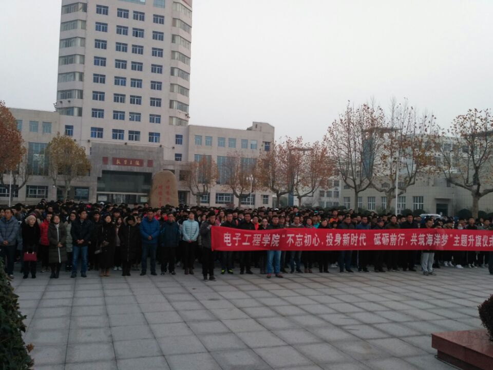 11月20日上午6时30分,电子工程学院“不忘初心,投身新时代,砥砺前行,共筑海洋梦”主题升旗仪式在苍梧校区教学主楼前广场隆重举行。学院领导、各系系务工作领导小组成员、辅导员、班主任以及全体学生参加了升旗仪式,仪式由刘家存老师主持。
