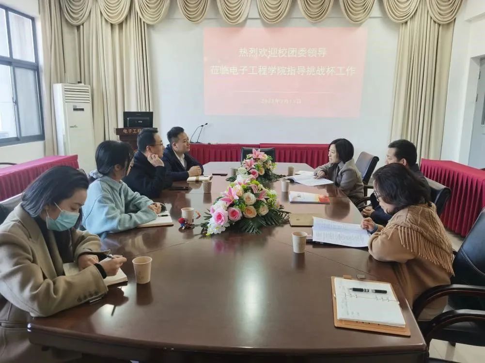 2023年3月13日,校团委书记黄吉庆、副书记王衍、黄媛、社团管理部部长赵婧宇一行来我院调研指导“挑战杯”备赛工作,学院党委书记马志同、副院长杨淼、副书记张玲、辅导员韩申参加会议。
