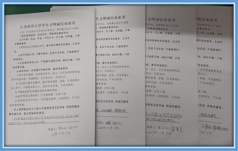 为增进学生对讲文明、守诚信的认知认同和行为认同,引导学生自觉将文明诚信行为品质融入日常学习生活,电子工程学院召开了“文明为先,诚信为本”的主题教育活动,会议由辅导员丁小青老师主讲。在对文明、诚信的重要性及意义讲解之后,丁老师组织学生认真学习了《江苏海洋大学学生文明诚信档案管理办法》,从政治文明、课堂文明、公益文明、网络文明、生活文明、学业诚信、经济诚信、就业诚信八个方面讲解了文明诚信评价参考标准的框架和基本内容。最后,动员全体大一新生仔细阅读并现场签署了《江苏海洋大学学生文明诚信承诺书》,共签署承诺书351份。