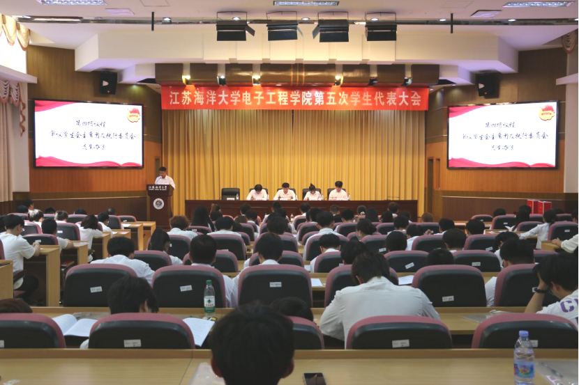6月16日下午,江苏海洋大学电子工程学院第五次学生代表大会在文博楼报告厅顺利召开。出席本次大会的有电子工程学院党委副书记张玲、海洋技术与测绘学院团委负责人纪成、电子工程学院团委负责人韩申、电子工程学院辅导员于子程、校学生会主席孔令洲、马卡洛夫海洋工程学院学生会主席丁意中、土木与港海工程学院学生会主席张袁歆、电子工程学院学生会主席陈振洋、王振宇、杨嘉恒、电子工程学院团委学生副书记蔡文文、杨硕以及电子工程学院138名学生代表。