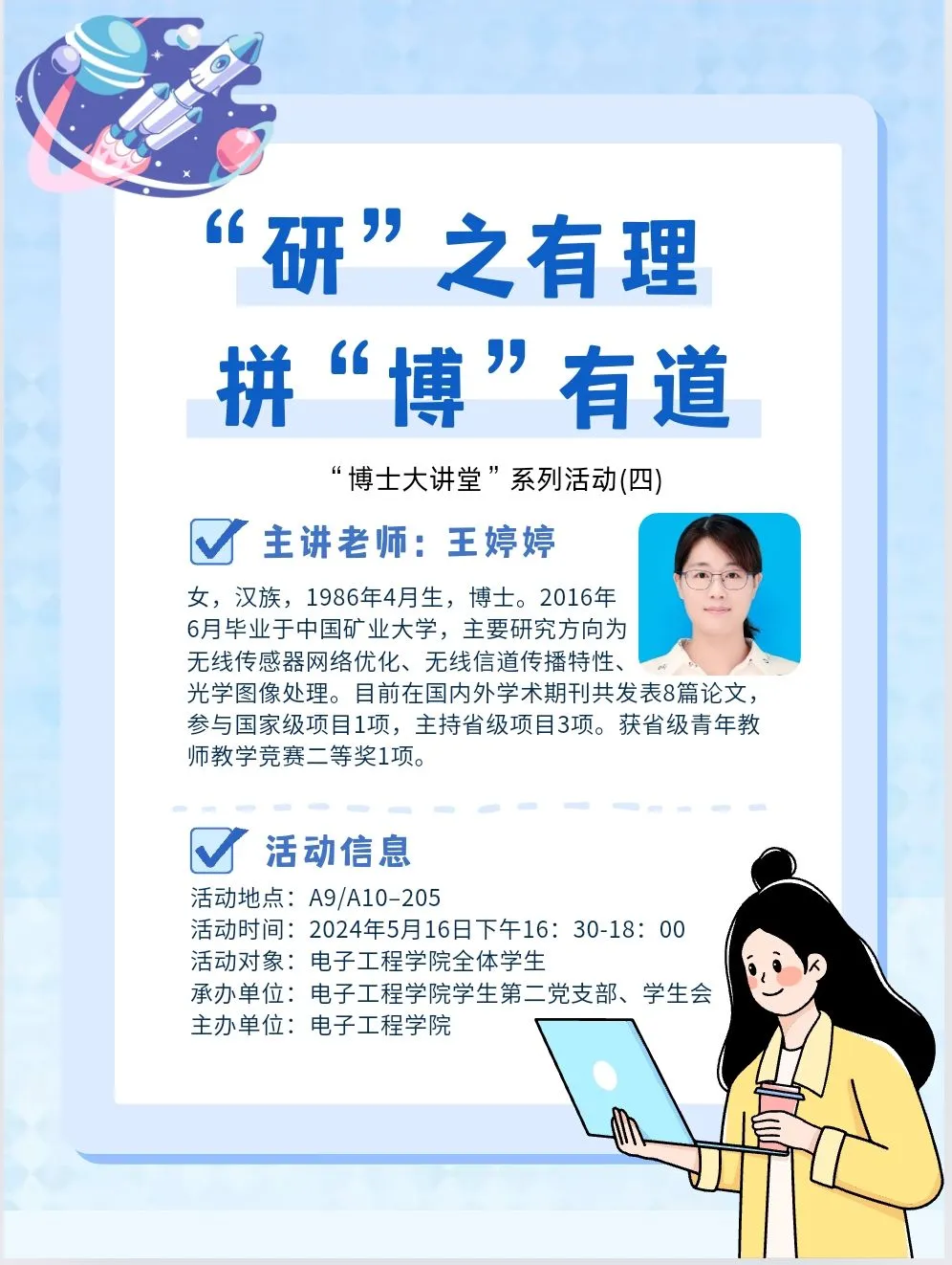 5月16日下午,由电子工程学院主办,院学生第二党支部、学生会承办的第四期“博士大讲堂”活动在A9/A10-205社区会议室成功举办。通信工程系的王婷婷博士以“‘研’之有理・拼‘博’有道”为主题开讲,近30名师生到场交流学习。王老师根据到场学生的年级分布特点,从打牢本科教育基础、升学方向及就业去向等方面进行了交流。王老师强调不论大学毕业时面临升学还是考研,都应立足本科培养过程,在学好学科基础课程、夯实学业基础的同时,深度攻克专业核心课程,增强专业核心竞争力。大学本科教育体系正在不断地完善,理论教育仍是目前课程的重要组成部分,同学们应在高等教育自由、全面发展的环境下,把握理论实践(如菜鸟教程、CSDN等网站)、关注科研动态(如人工智能大讲堂、阅智网等微信公众号等),充分利用国家公共开放教育平台(中国大学MOOC等),丰富专业知识结构。王老师向同学们展示了优秀班集体通信1221班在大二上的学科竞赛获奖情况,鼓励学生提前做好学业规划。又对通嵌171班学生升学去向、就业方向做了调研介绍,通过往届实例向学生们介绍了考研过程中在择业、择校等环节中可能遇到的问题,并解读了往届学生寄语:劳逸结合、学习规划、全力以赴、追逐梦想!王老师还介绍了学院提供的开放实验室和各种学科竞赛指导,让现场的同学们充分认识到院系对学生悉心培养的决心。讲座中,王老师还分享了自己读研直博的经历,与学生讨论了理工科的研究内容,主要包括理论创新、方法创新以及项目导向的系统开发,指出科研的理论探索具有不确定性,应注重培养团队协作精神,保持学术谦逊、学海无涯的奋斗状态。最后王老师用苏轼的名言“古之立大事者,不惟有超世之才,亦必有坚韧不拔之志。”与学生共勉。