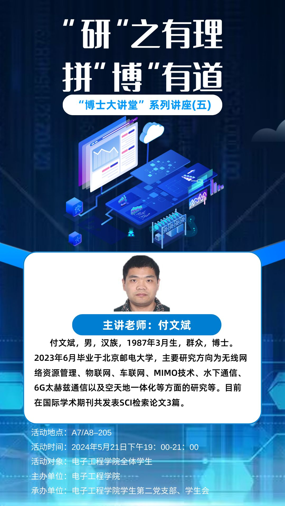 5月21日下午,电子工程学院在A7/A8-205社区会议室举办了第五期“博士大讲堂”活动,该活动由院学生第二党支部和学生会承办。本期讲座的主题是“有梦想就要去追,万一实现了呢!”,由通信系的付文斌博士主讲,吸引了近60名师生参与交流学习。付老师以自己的求学经历和所面临的困惑开场,通过分析社会现象和举例草根逆袭的故事,如济宁医学院学生2022年考研逆袭和郭有才的网络走红等,强调了树立人生理想的重要性以及通过不懈努力实现人生目标的可能性。