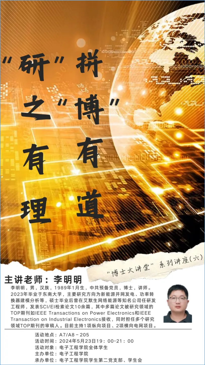 5月23日下午,电子工程学院在A7/A8-205社区会议室举办了第六期“博士大讲堂”活动,该活动由院学生第二党支部和学生会承办。本期讲座的主题是“花有重开日,人无再少年”,由电气系的李明明博士主讲,吸引了近60名师生参与交流学习。