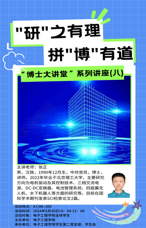 5月30日下午,由电子工程学院主办,院学生第二党支部、学生会承办的第八期“博士大讲堂”活动在A7/A8-205社区会议室成功举办。自动化系的张正博士以“‘研’之有理・拼‘博’有道”为主题开讲,近30名师生到场交流学习。