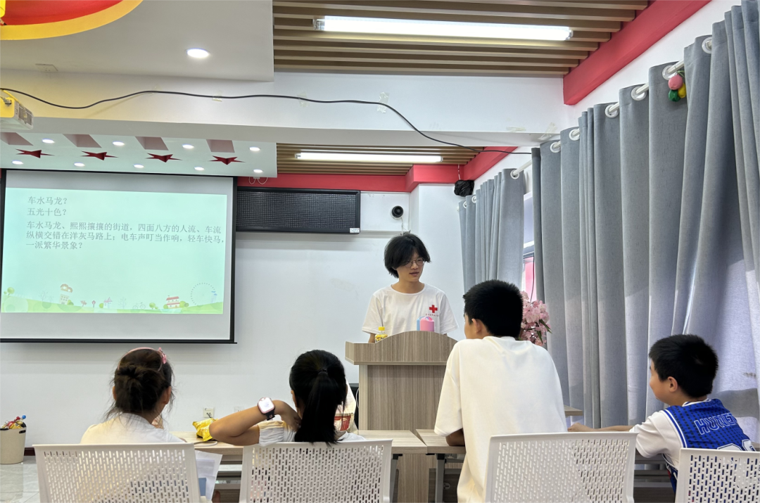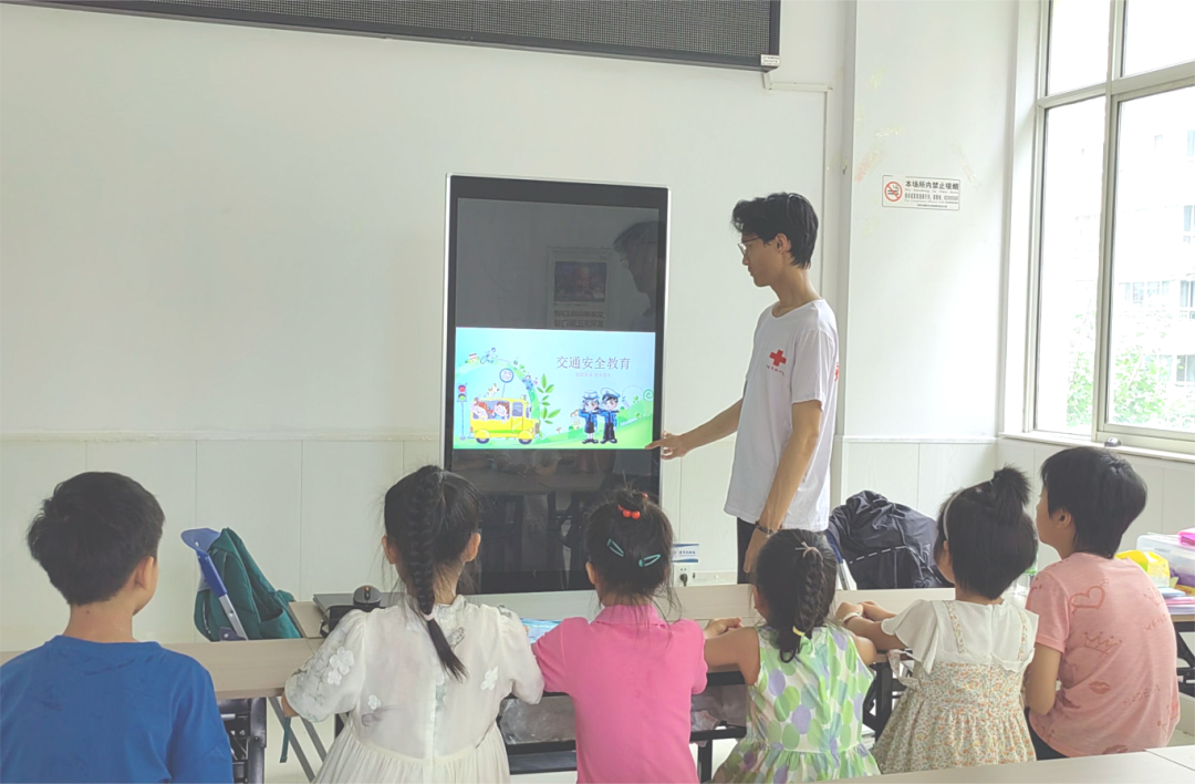志愿者改变传统的问答形式,采用小组讨论、代表展示的上课方式,结合孩子们日常生活,详细讲解步行安全和乘车安全两部分内容,充分发挥同学们的主观能动性。