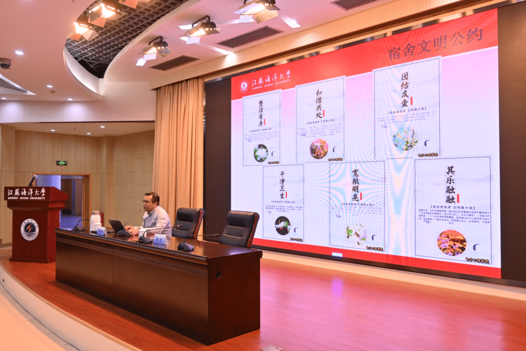 穆老师以生活服务模块中的《江苏海洋大学本科生住宿管理办法(修订)》(江海大学〔2020〕99号)文件为重点,详细解读各章条款,包括总则、住宿及走读、公寓公共设施及相关规定、公寓安全及维护、公寓文明、卫生及秩序、奖惩办法等内容,通过深入细致的文件学习,培养学生“强烈的安全意识,良好的卫生习惯,严谨的生活作风,向上的学习风气,互助的团队精神,健康的审美情趣”,创建“安全、文明、和谐、舒适”的学生宿舍环境和氛围。其次,穆老师以2024年文明宿舍创建工作为载体,解读我院实施方案,结合学生个人生活事务综合评定办法,以“舍风建设、学风建设、内务卫生、安全秩序”为活动目标,进一步营造环境整洁、学风上进、安全温馨的宿舍氛围,构建宿舍良好环境。随后,穆老师就宿舍文明公约进行分享和交流,同中华优秀传统文化相结合,以整洁有序、和谐共处、团结友爱、干净卫生、宽敞明亮、其乐融融等六个方面,共建宿舍是我家、文明靠大家,实现学生自我管理、自我成长,尽快适应大学生活。最后,穆老师以学生大数据为基础,分析了预警名称和预警规则,提醒学生虽然有线上的预警,但是更重要的是线下的行为自觉,强调每位同学都要遵守宿舍管理制度,每位宿舍长都要高度重视,按时按要求上报宿舍归寝情况。