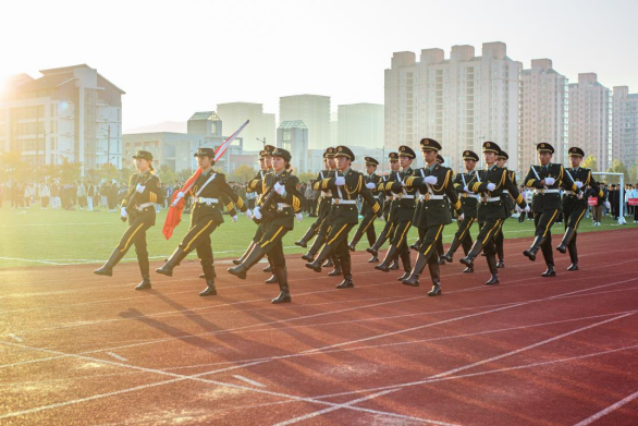 天朗气清,红旗猎猎。清晨七时,升旗仪式正式开始。国旗仪仗队的同学们迈着铿锵有力的步伐,护卫着国旗走向升旗台。伴随着雄壮嘹亮的《义勇军进行曲》,鲜艳的五星红旗冉冉升起,在熠熠晨光中迎风飘扬。面向国旗,全场人员庄严肃立行注目礼,大家齐声高唱中华人民共和国国歌,激动人心的旋律、飞扬嘹亮的歌声响彻云霄。