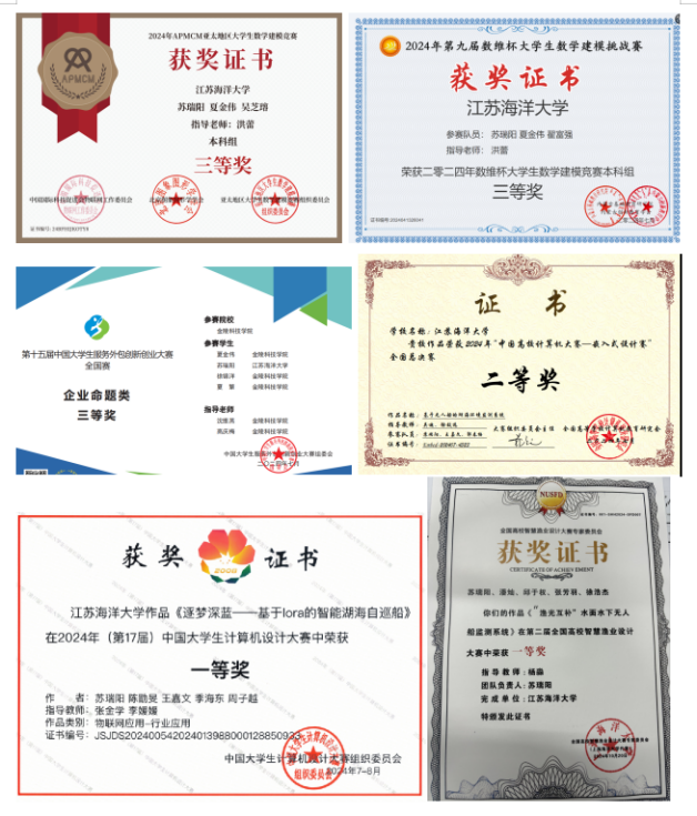 个人简介:苏瑞阳,海信1221班长。保持两学年专业成绩第一,积极参与校内外学科竞赛,通过努力已获得国家级奖项6项、省奖7项、校级奖项20余项,担任省级大创项目负责人一项,参与大创项目4项。以第一作者身份在EI会议发表文章2篇,申得计算机软件著作权4项、专利受理3项。