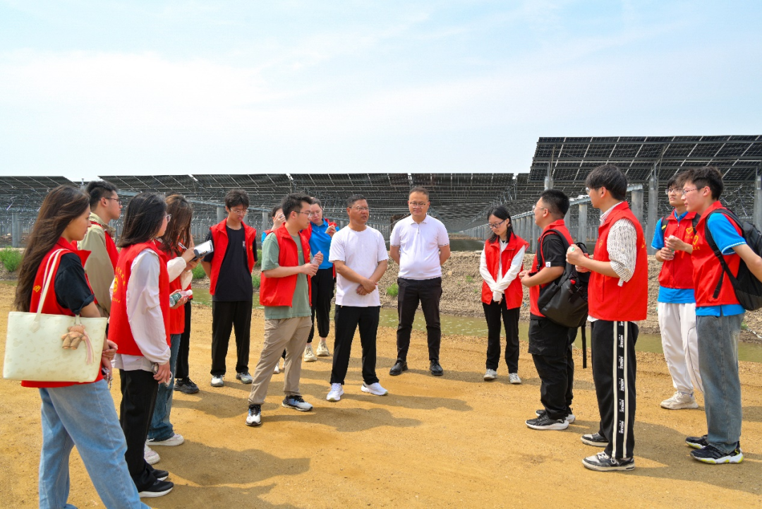 当日,项目部相关负责人对实践团一行表示热烈欢迎,并全程协调调研工作。在专业技术人员的引导下,实践团成员首先对基地整体规划布局进行系统了解,随后深入各个核心功能区域开展实地考察。基地内,户外光伏装置在阳光下高效运转,智能监控系统全天候实时监测;室内电力转换控制设备精密运行,各环节展现出高度集成化与智能化的技术特征。通过实地参观,实践团成员得以突破书本理论与实验室研究的局限,对“渔光互补”项目的实际应用场景形成直观且深刻的认知。