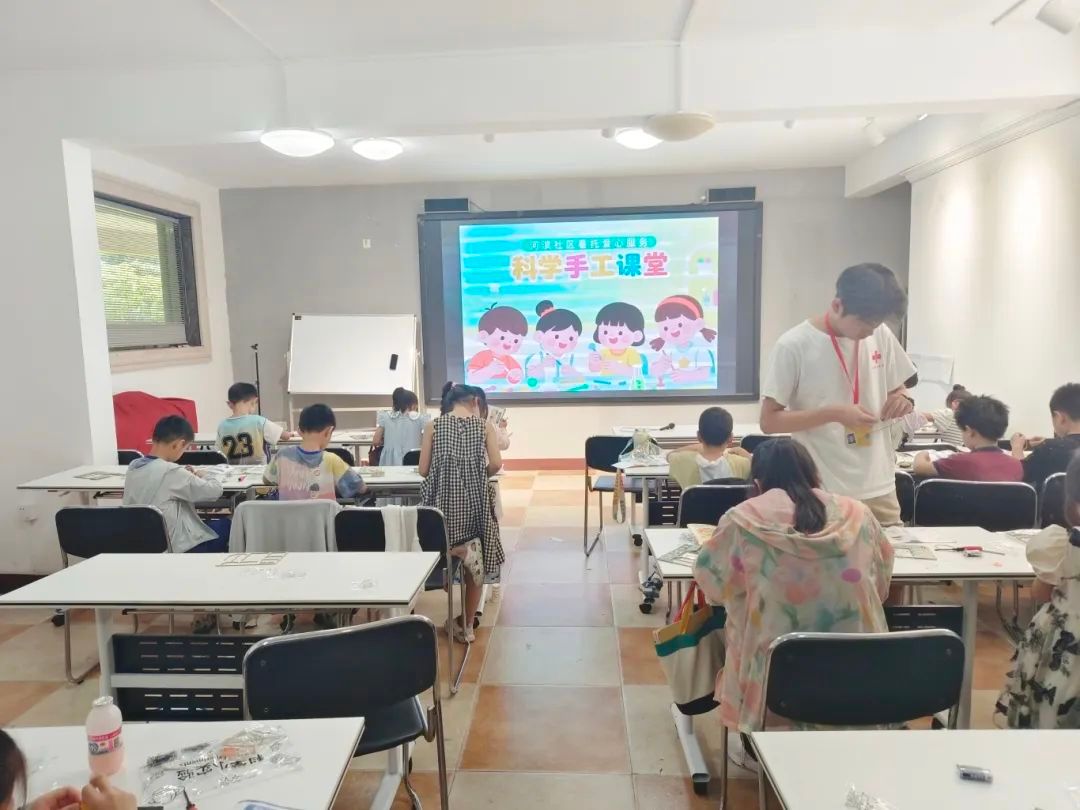 开班第三周,E馨志愿服务团在郁洲街道部分社区开展了丰富多彩的暑期课程。上午,志愿者们分赴西凤、河滨、东苑高新、学院四个社区同步开课,通过课业辅导、绘本共读、积极心理学课堂等形式,为孩子们打造全方位的成长空间。“心压解法”心理课程帮助孩子们掌握情绪管理技巧,课外伴读活动带领孩子们品读经典文学作品,培养阅读兴趣,观影活动让孩子们在光影中感受到了艺术的魅力。下午的科学实践课堂上,“水果电池”实验、“水火箭”制作与发射、非遗漆器、机械密码箱制作等活动,既激发了孩子们对科学的浓厚兴趣,又锻炼了动手能力。连云港市革命纪念馆的实践研学,更让孩子们在视听体验中拓展视野、收获成长。