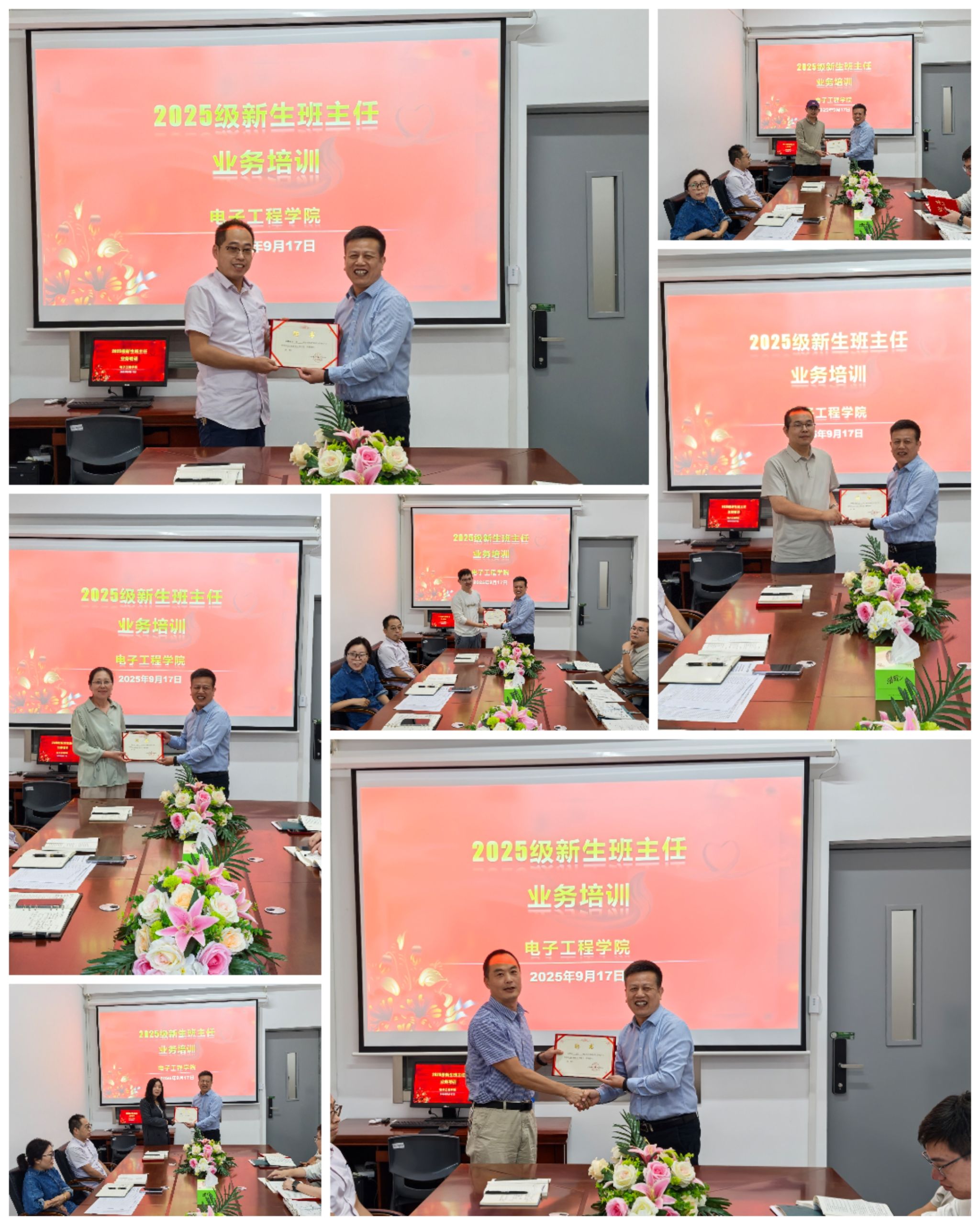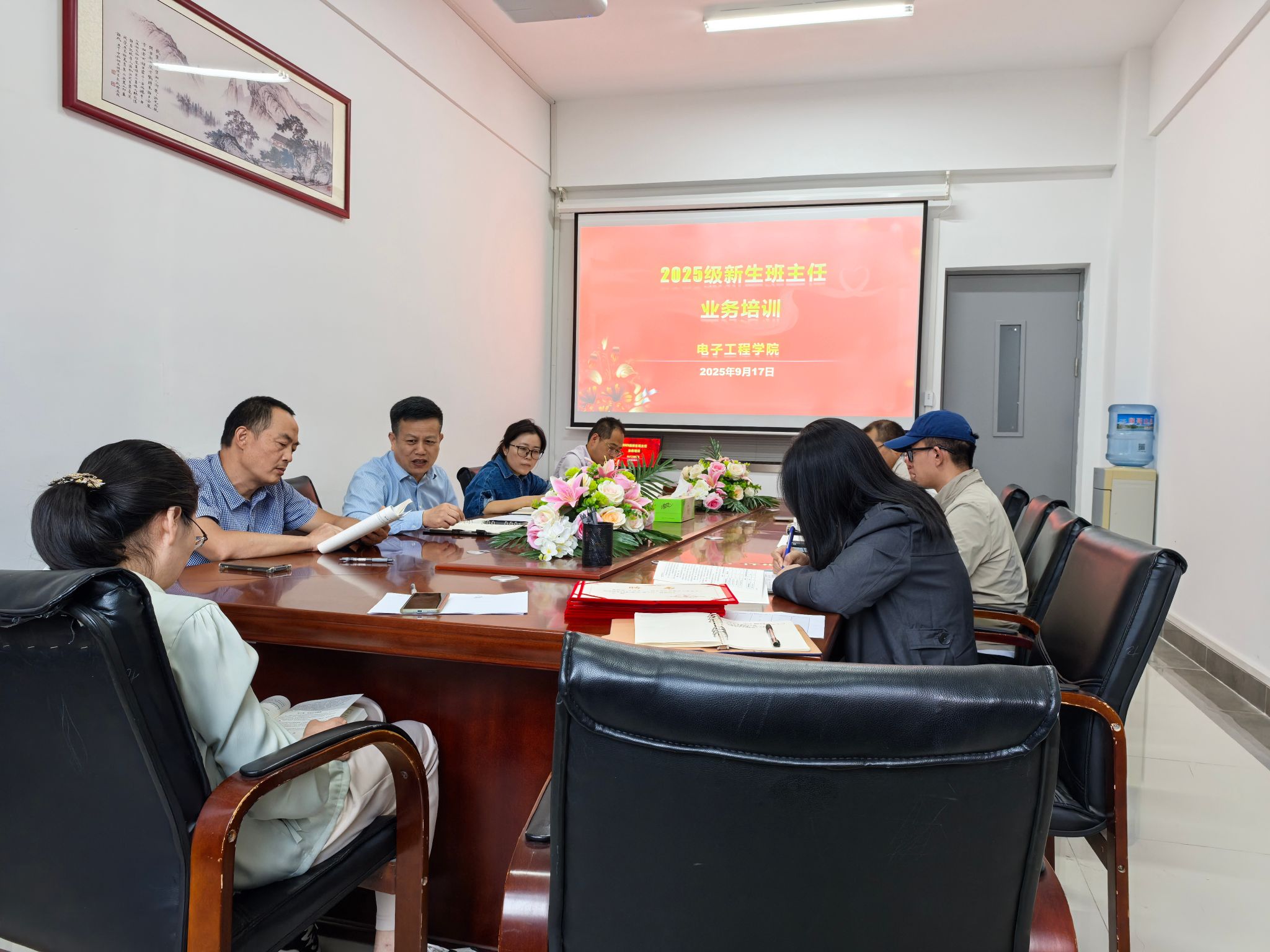 9月17日下午,电子工程学院在电子楼309会议室召开2025级新生班主任聘任暨培训会议。会议由院党委副书记张玲主持,院党委书记马志同、新聘任的2025级全体新生班主任、辅导员韩申、李忍忍共同参会。