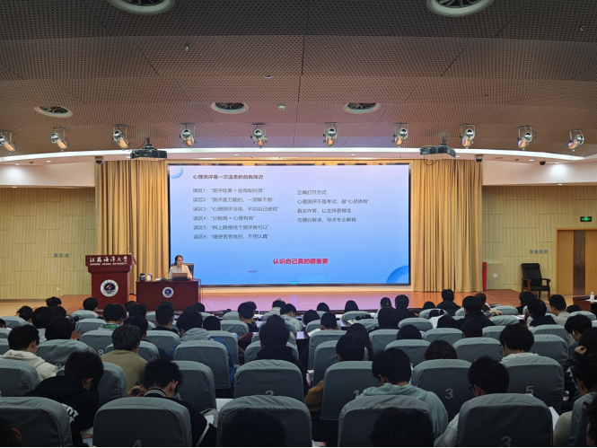 在第二环节中,李老师引导新生开展心理健康普测,并以“大学与自我的发现”为主题,阐述了心理测评的科学意义。她详述,心理测评并非“贴标签”,而是帮助新生客观评估情绪状态、社会支持水平及人格特质的重要工具。