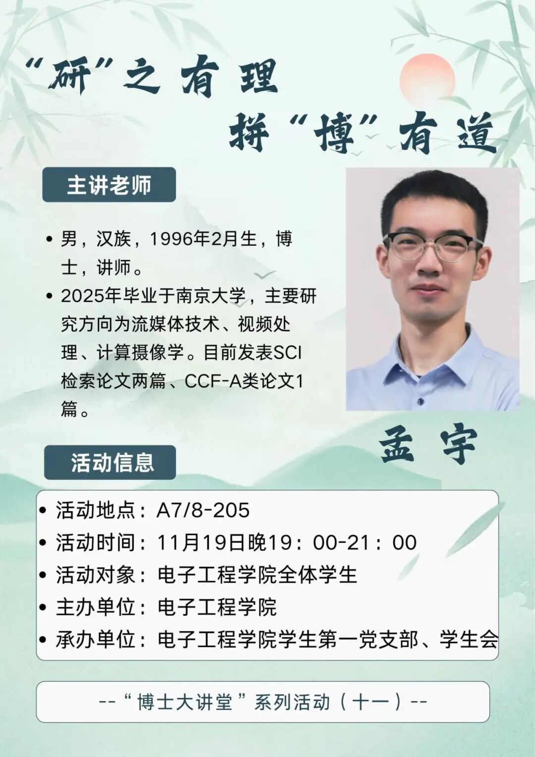 为弘扬科学精神,助力学生成长,电子工程学院精心打造“博士大讲堂”系列讲座。活动旨在通过优秀青年博士的经验分享,为同学们搭建学术交流平台,传承科研薪火,激励广大学子在探索未知的道路上坚定前行。