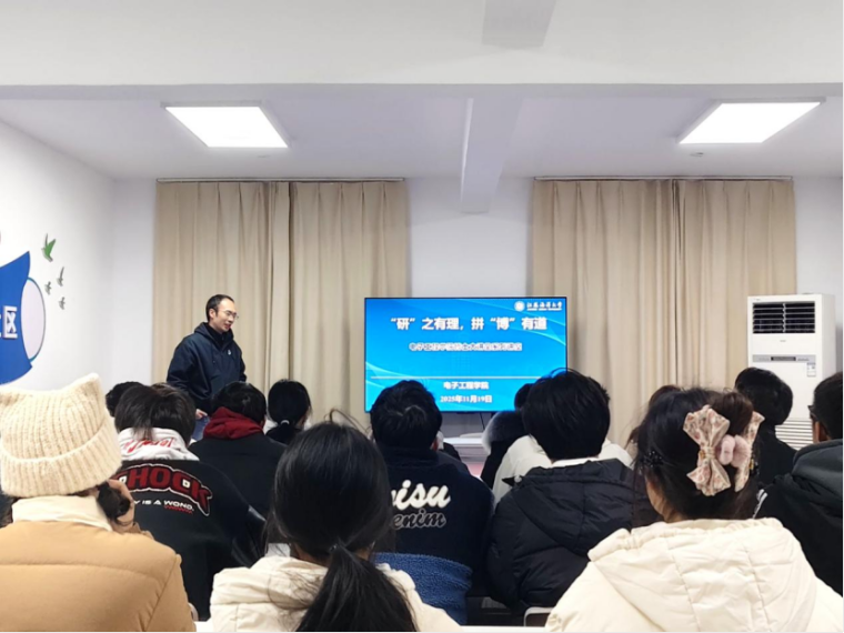 2025年11月19日晚,电子工程学院举办“博士大讲堂”系列讲座。本次活动特邀学院讲师孟宇博士担任主讲嘉宾,结合自身科研与职业发展经历,为同学们带来一场内容丰富、启发性强的交流讲座。讲座由辅导员李忍忍主持,吸引20余名本科生积极参与。