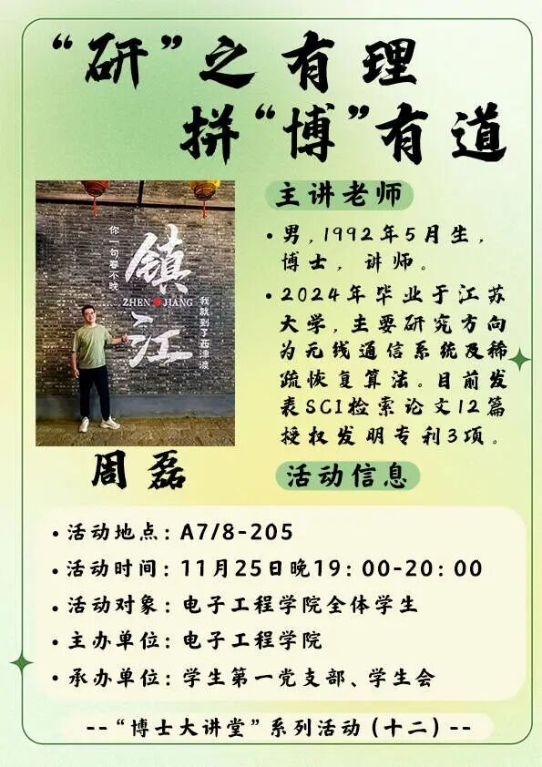 为厚植科学精神沃土,助力青年学子成长,电子工程学院精心打造 “博士大讲堂” 系列精品讲座。活动以优秀青年博士的科研经验与成长感悟为纽带,搭建起跨年级、零距离的学术交流桥梁,旨在传承严谨求实的科研薪火,凝聚勇攀高峰的奋进力量,激励广大学子以好奇心驱动探索,以毅力攻坚克难,在追逐科学真理、探索未知领域的道路上坚定信念、笃行不怠。