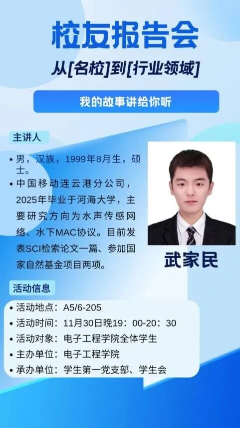 为帮助同学们明确大学发展方向,搭建校园与职场的沟通桥梁,11月30日晚,电子工程学院在A5/6-205学生社区举办校友分享会。本次分享会邀请到2017级电子信息专业优秀校友武家民主讲,他本科毕业后考研深造,获河海大学电子信息硕士学位,今年7月入职中国移动连云港分公司,以自身成长经历为大一新生和研究生们带来了一场实用性极强的经验分享。
