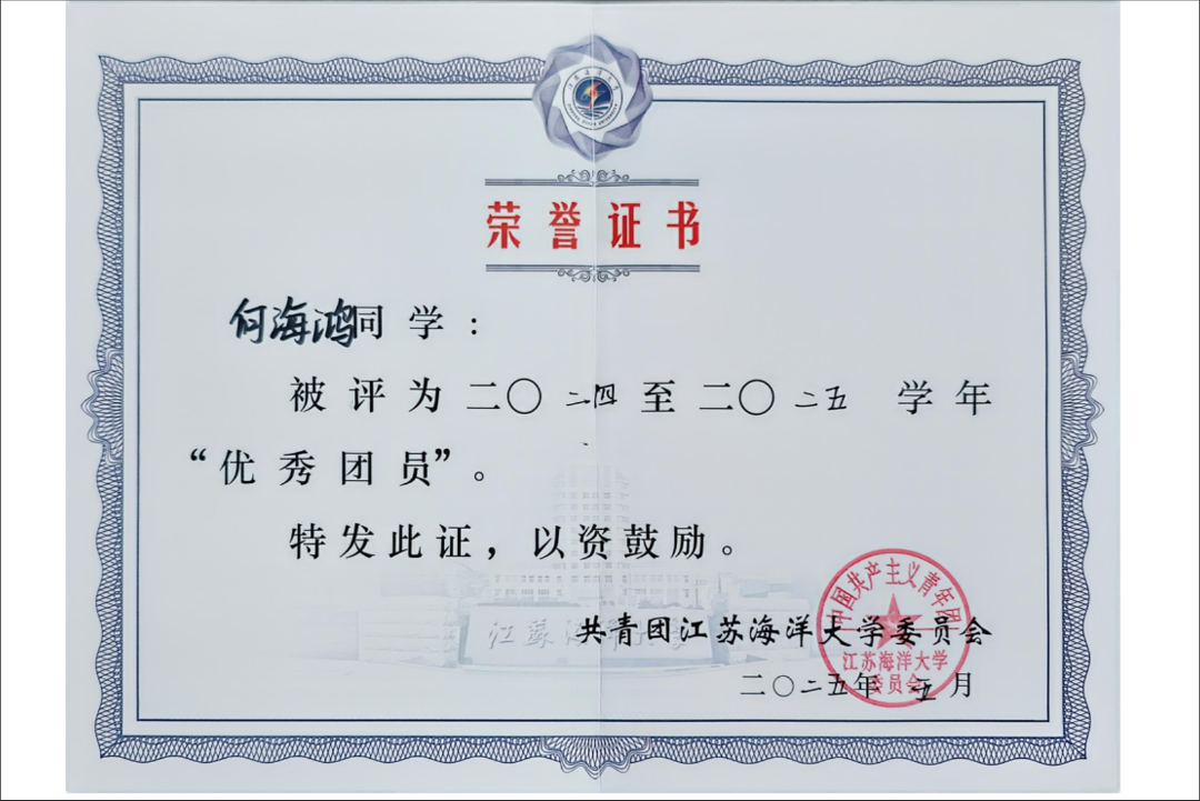 何海鸿,江苏海洋大学电子工程学院控制理论与控制工程专业2023级硕士研究生,汉族,共青团员。荣获研究生二等学业奖学金两次、一等学业奖学金一次、校“优秀团员”“社会实践先进个人”等荣誉。以第一作者发表SCI一区论文一篇,以导师第一、本人第二作者身份发表SCI二区论文两篇和SCI三区论文两篇。