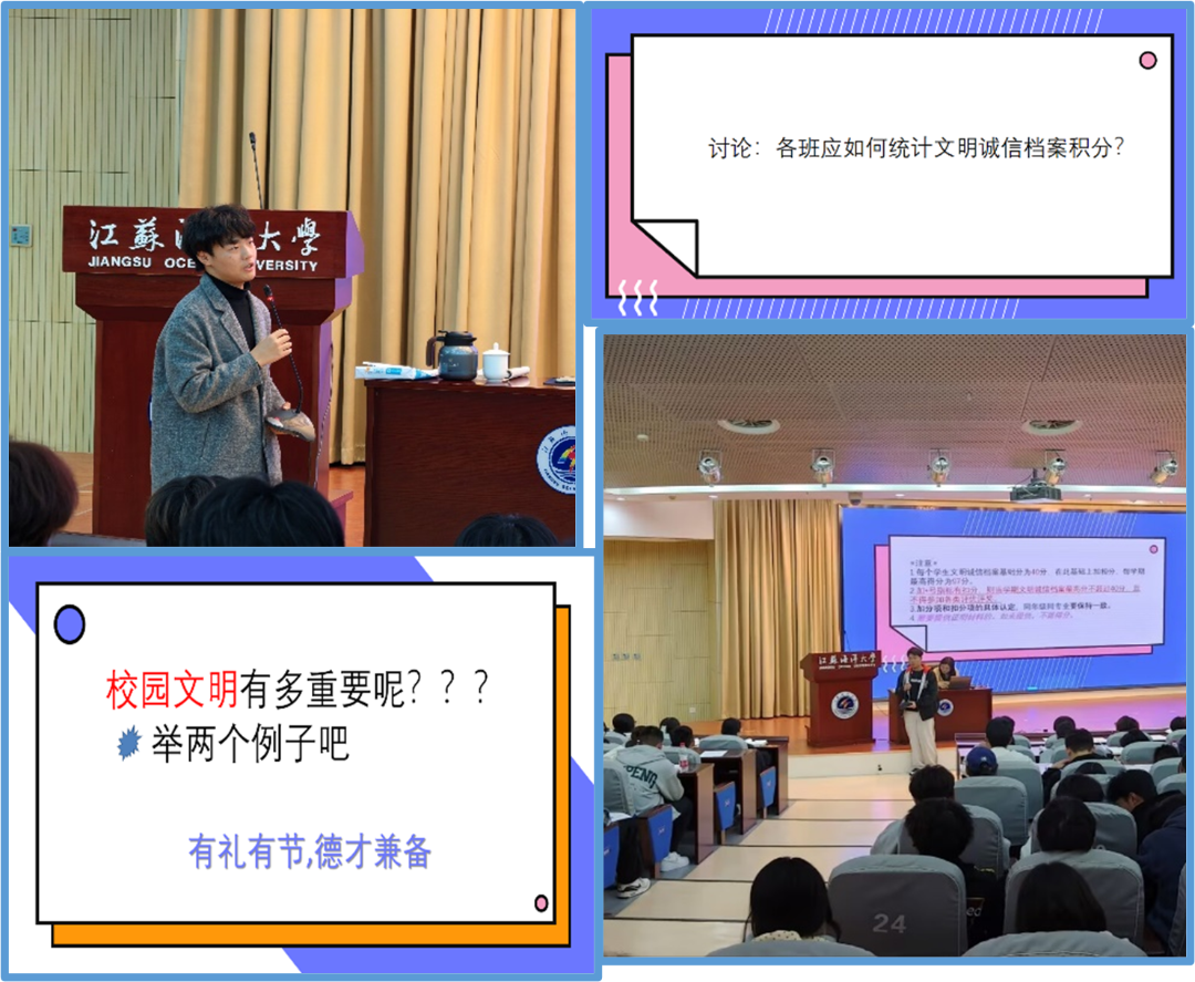 会上针对“大学生校园文明行为规范”“班级文明诚信记录管理”进行了热烈的互动交流。