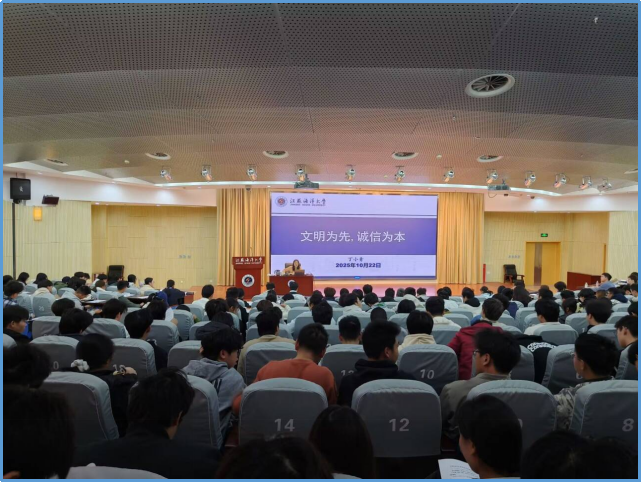10月22日下午,电子工程学院于黄海厅举办了电子工程学院2025级本科新生入学教育会,主要围绕文明诚信和体质测试两个主题展开,会议由辅导员丁小青老师主讲,电子工程学院全体2025级本科生新生参加了会议。