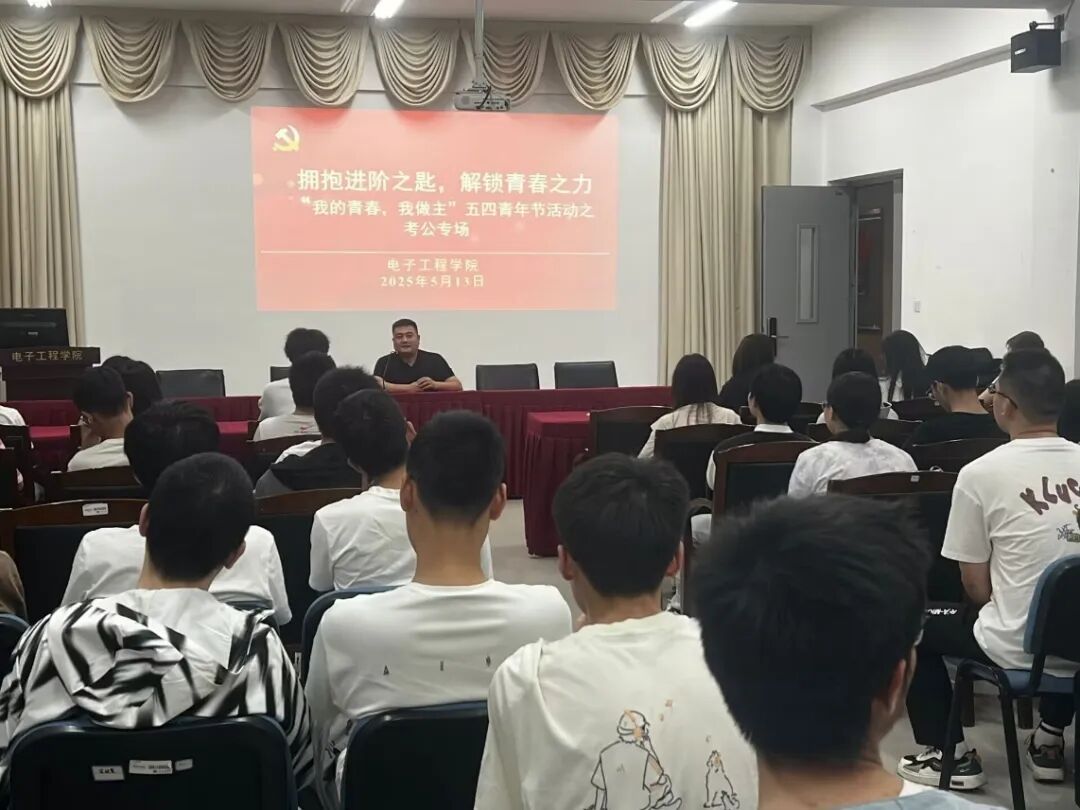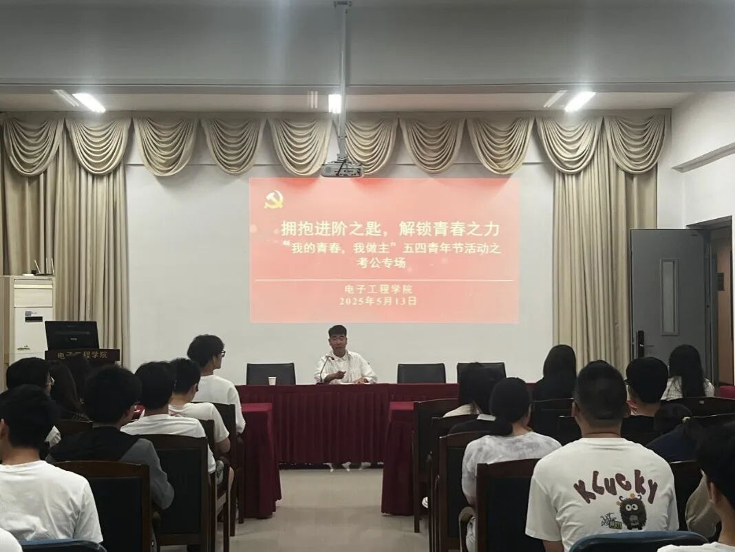 为帮助同学们明确考公就业规划、提升备考能力,5月13日下午,电子工程学院于电子楼314会议室举办了考公经验分享会,会议由电子工程学院易班工作站主办、电子工程学院学生第二党支部承办。作为“我的青春,我做主”五四青年节主题教育系列活动之一,本次分享会突出“从备考到上岸的全流程实战指南”主线,以“系统思维,精准努力”为主题,围绕考公路径设计等热点议题,分享考公的创新思路与实践策略。会议由电子工程学院学工办主任丁小青老师主持,近70名同学参加了本次分享会。