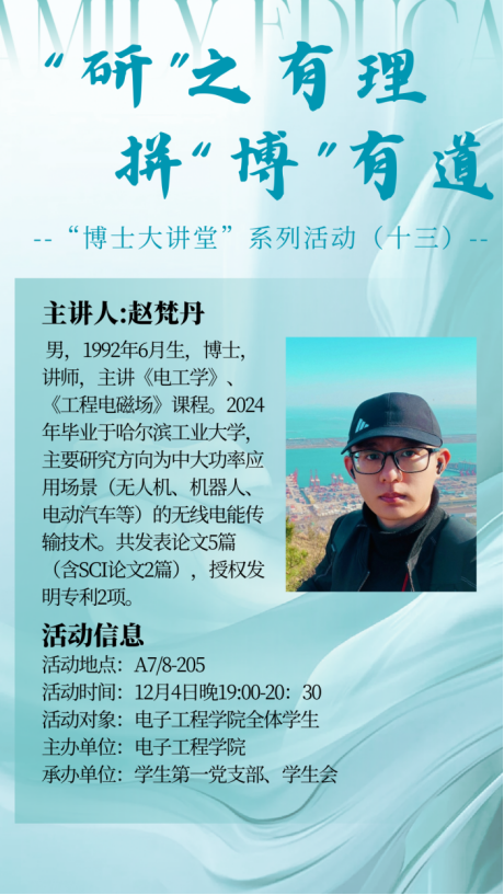 为让科学精神在校园落地生根,助力青年学子实现全面成长,电子工程学院精心策划“博士大讲堂”系列精品讲座。依托优秀青年博士的科研经历与成长感悟这一核心载体,构建沟通桥梁,旨在延续严谨求实的科研血脉,凝聚敢于攀登、勇创佳绩的奋斗力量,激励学子凭借好奇心开启探索之旅,以顽强毅力突破挑战,在追逐科学真理、探索未知疆域的道路上坚守初心。