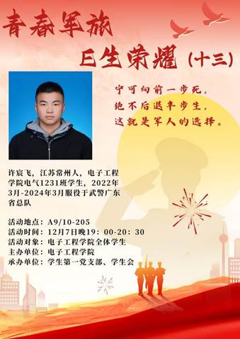 许宸飞,男,江苏常州人,电子工程学院电气1231班学生,2022年3月---2024年3月服役于武警广东省总队。
