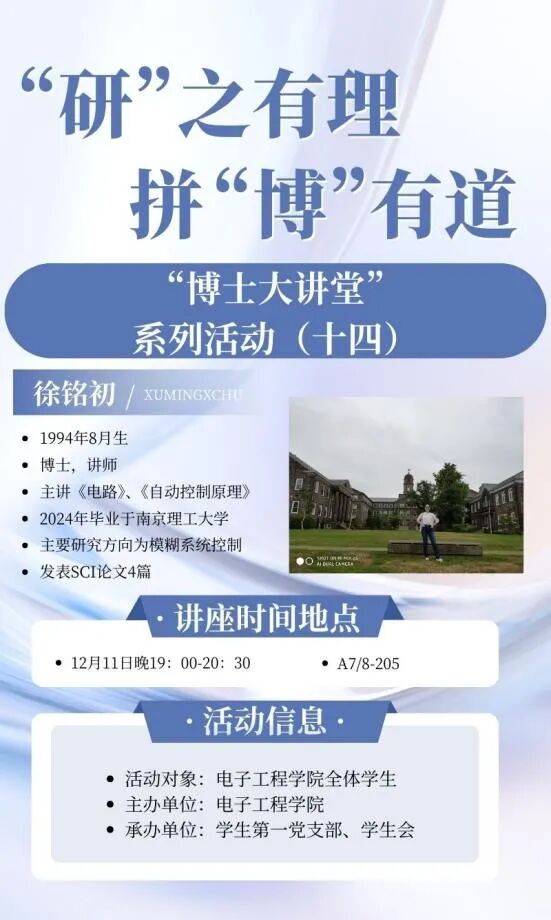 12月11日晚7点,电子工程学院在学生社区A7/8-205举办博士大讲堂活动。本次讲座邀请自动化专业徐铭初博士主讲。为学生带来“低空经济”相关的专业分享。