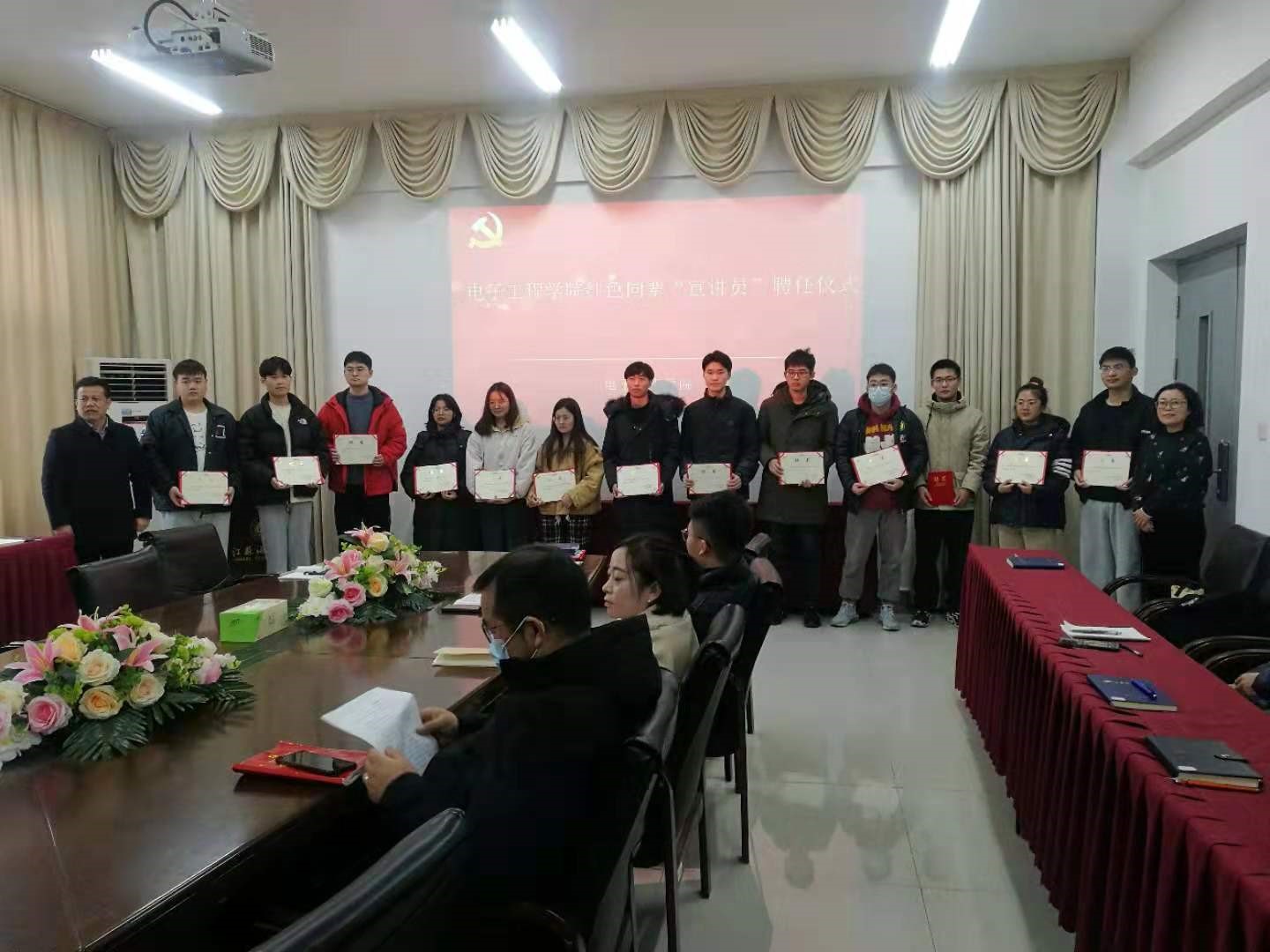 为宣扬红色文化,激发大家爱国爱党情怀,按照学院党委党史学习教育安排部署,12月9日中午,电子工程学院在电子楼314会议室召开“红色同辈”宣讲员聘任大会。电子工程学院党委书记马志同、党委副书记张玲、全体辅导员、各班级学生代表,共70余人参加活动。