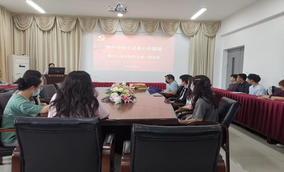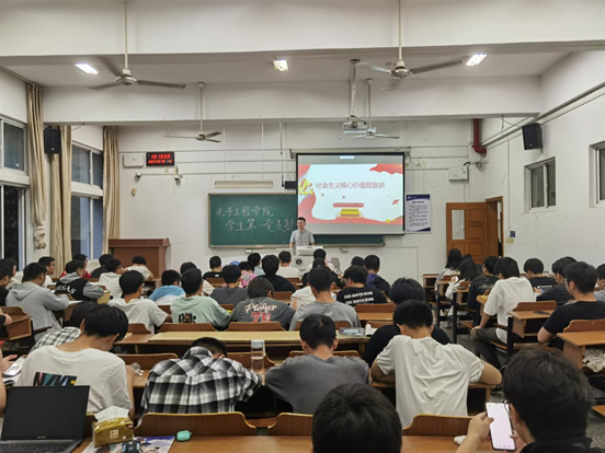 为坚定信仰、增强党性、提高素质,引导青年学生学习社会主义核心价值观的内涵和要求,5月26日,电子工程学院学生第一党支部书记李婷做了“大学生教育中培育和践行社会主义核心价值观的实现路径”的宣讲。5月30日晚学生第一党支部的党员同学继续在文通楼110教室以“践行社会主义核心价值观,引导学生全面发展---宣传优秀党员事迹”开展主题讲座,电子专业22级全体学生参加。
