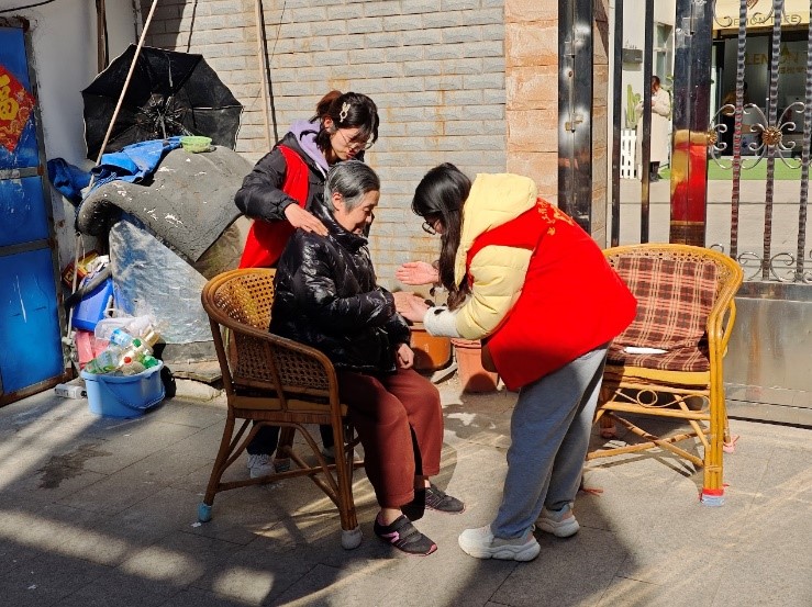 心系桑榆晚,情暖夕阳红。活动现场,学生党员们给老人们分发精心准备的礼物,让他们感受到社会大家庭的温暖。然后积极主动地帮忙整理收拾房间,能做的事尽量多做一点,尽可能多分担一些辛劳。同学们带着老人晒太阳,为他们捏捏肩,涂护手霜。在老人们的笑声里,同学们蹲下身与他们耐心交谈,或闲话家常,或倾听心声,或关切询问……温馨、和谐的画面散发着岁月静好的安宁之光。