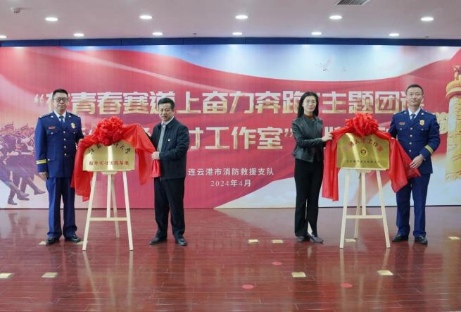 团市委王帆副书记与支队张永利主任、江苏海洋大学电子工程学院马志同书记与支队程涛副支队长分别为支队“信通人才工作室”、“江苏海洋大学校外实习实践基地”揭牌。