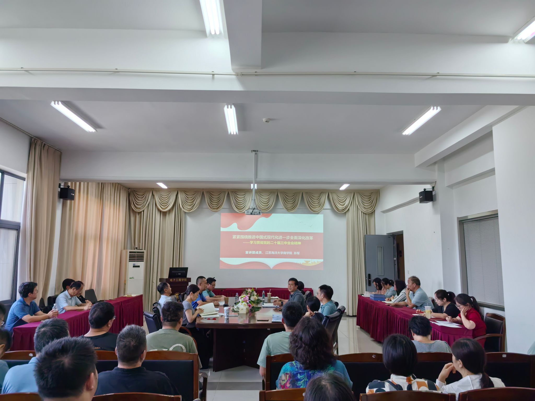 为深入学习贯彻党的二十届三中全会精神,以全会精神为指引,进一步推进学院各项工作发展,9月18日下午,电子工程学院举行宣讲会,特邀校宣讲团成员、商学院院长孙军教授做辅导报告。学院党委书记马志同主持会议并讲话。