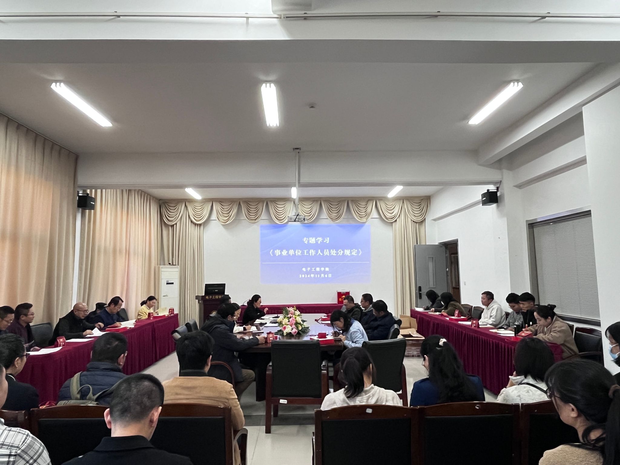11月6日下午,电子工程学院组织教职工集中学习《事业单位工作人员处分规定》。