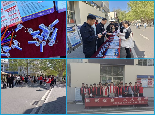 2025年4月15日上午,在学校第一食堂北侧,江苏海洋大学保卫处、郁洲派出所、江苏海洋大学电子工程学院联合举办“4•15全民国家安全日”国家安全教育宣传活动,迎接全民国家安全教育日和总体国家安全观提出十周年。学校保卫处、郁洲派出所、电子工程学院负责人出席了活动。
