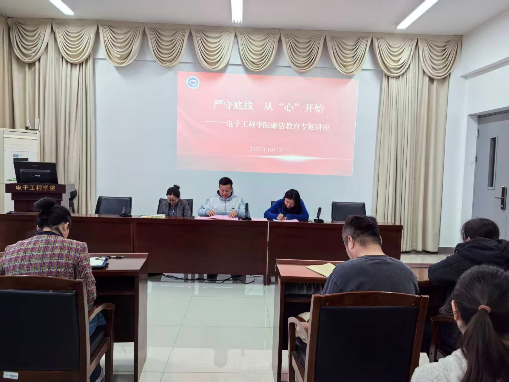 为进一步加强党风廉政建设,10月21日,电子工程学院廉洁教育专题讲座在电子楼314举行。学院党委书记马志同担任主讲,作了题为“严守底线 从心开始”的专题报告。学院班子成员、全体行政人员及各党支部书记参加了学习。