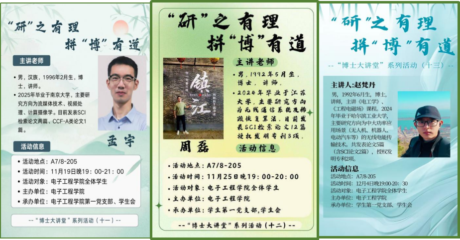 为弘扬科学精神,助力学生成长,电子工程学院精心打造“博士大讲堂”系列讲座。活动旨在通过优秀青年博士的经验分享,为同学们搭建学术交流平台,传承科研薪火,激励广大学子在探索未知的道路上坚定前行。